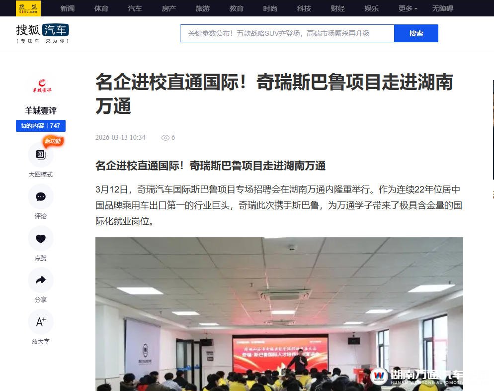 3月12日,奇瑞汽车国际斯巴鲁项目专场招聘会在湖南万通内隆重举行。作为连续22年位居中国品牌乘用车出口第一的行业巨头,奇瑞此次携手斯巴鲁,为万通学子带来了极具含金量的国际化就业岗位。